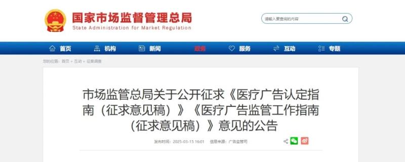 近日,國(guó)際市場(chǎng)監(jiān)督管理總局發(fā)布《醫(yī)療廣告認(rèn)定指南(征求意見(jiàn)稿)》和《醫(yī)療廣告監(jiān)管工作指南(征求意見(jiàn)稿)》,并向社會(huì)公開(kāi)征求意見(jiàn),反饋意見(jiàn)截止日期為2025年4月16日。