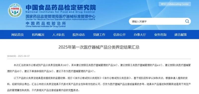 4月7日,國家藥監(jiān)局醫(yī)療器械標(biāo)準(zhǔn)管理中心發(fā)布《2025年第一次醫(yī)療器械產(chǎn)品分類界定結(jié)果匯總》,本次匯總的均為體外診斷試劑產(chǎn)品,共有168個(gè),其中建議按照Ⅲ類醫(yī)療器械管理的產(chǎn)品24個(gè),建議按照Ⅱ類醫(yī)療器械管理的產(chǎn)品46個(gè),建議按照Ⅰ類醫(yī)療器械管理的產(chǎn)品65個(gè),建議不單獨(dú)申報(bào)的產(chǎn)品24個(gè),建議不作為醫(yī)療器械管理的產(chǎn)品9個(gè)。