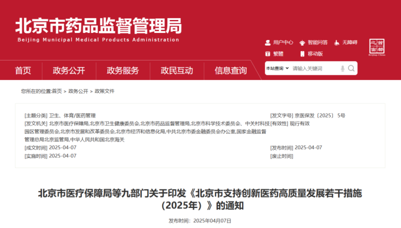 4月7日,北京市醫(yī)療保障局、北京市藥監(jiān)局等九部門(mén)發(fā)布《北京市支持創(chuàng)新醫(yī)藥高質(zhì)量發(fā)展若干措施(2025年)》(以下簡(jiǎn)稱《措施》),《措施》共分為八個(gè)部分,包括:持續(xù)促進(jìn)臨床試驗(yàn)提質(zhì)增效(5條)、不斷提升審評(píng)審批效能(6條)、持續(xù)擴(kuò)大創(chuàng)新醫(yī)藥生產(chǎn)流通(6條)、持續(xù)推動(dòng)創(chuàng)新醫(yī)藥臨床使用(5條)、人工智能賦能醫(yī)藥創(chuàng)新發(fā)展(2條)、加強(qiáng)創(chuàng)新醫(yī)藥投融資支持(2條)、優(yōu)化創(chuàng)新醫(yī)藥產(chǎn)業(yè)布局(2條)和保障措施(4條)。