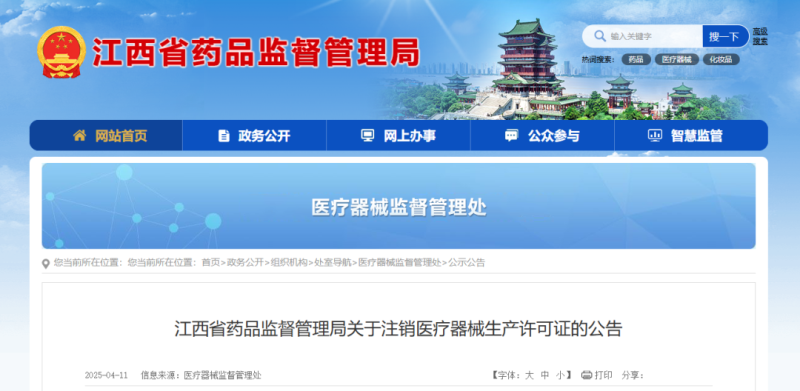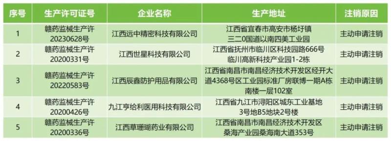 近日,江西省藥監(jiān)局發(fā)布公告稱(chēng),根據(jù)《中華人民共和國(guó)行政許可法》《醫(yī)療器械監(jiān)督管理?xiàng)l例》《醫(yī)療器械生產(chǎn)監(jiān)督管理辦法》規(guī)定,該局已依法注銷(xiāo)江西遠(yuǎn)中精密科技有限公司、江西世星科技有限公司等5家企業(yè)的《醫(yī)療器械生產(chǎn)許可證》,注銷(xiāo)原因均為“主動(dòng)申請(qǐng)注銷(xiāo)”,具體明細(xì)如下: