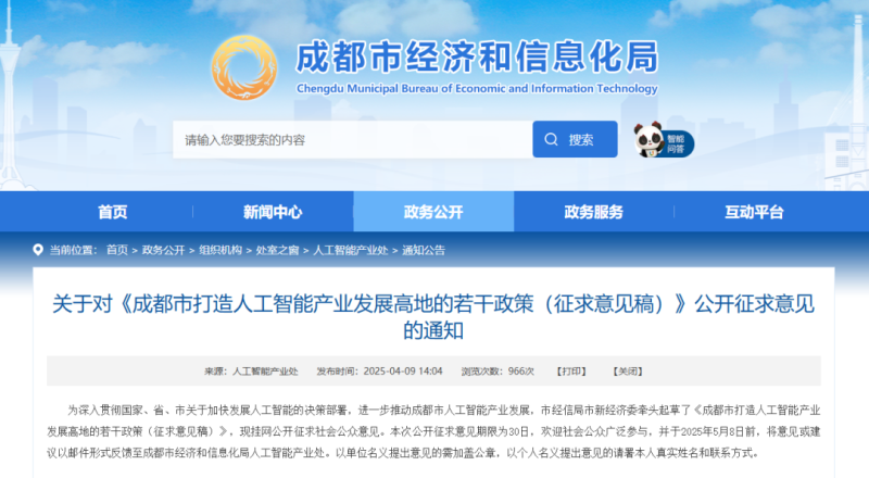 近日,成都市經(jīng)濟(jì)和信息化局發(fā)布《成都市打造人工智能產(chǎn)業(yè)發(fā)展高地的若干政策(征求意見稿)》(以下簡稱《政策》),并向社會公開征求意見?!墩摺窂淖鰪?qiáng)產(chǎn)業(yè)載體、拓展場景應(yīng)用、優(yōu)化算力供給、推動模型應(yīng)用、盤活數(shù)據(jù)資源、鼓勵企業(yè)上榜、支持品牌推廣、引育頂尖人才、強(qiáng)化金融支持九個方面入手,進(jìn)一步推動成都市人工智能產(chǎn)業(yè)發(fā)展,助推打造人工智能產(chǎn)業(yè)發(fā)展高地。