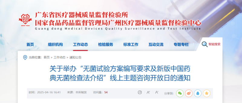 近日,廣東省醫(yī)療器械質量監(jiān)督檢驗所官網發(fā)布通知,定于4月27日(周日)舉辦“無菌試驗方案編寫要求及新版中國藥典無菌檢查法介紹”線上主題咨詢開放日活動,具體時間及參會方式如下: