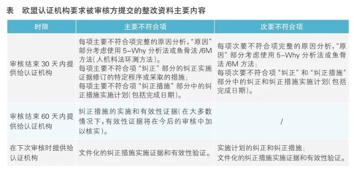 針對審核發(fā)現(xiàn)的不符合項,歐盟認(rèn)證機(jī)構(gòu)要求被審核方提交原因分析、糾正措施等整改資料(詳見表)。