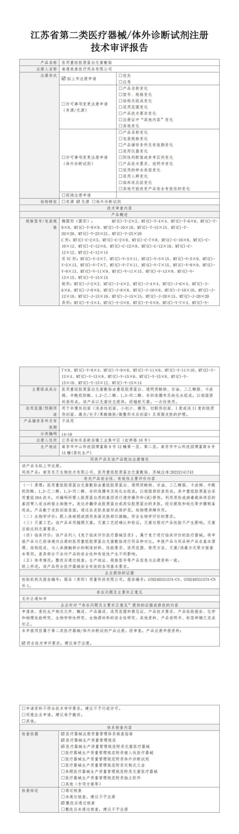 5月12日,江蘇省藥監(jiān)局公布了2025年4月批準(zhǔn)注冊的水性聚氨酯避孕套、醫(yī)用透明質(zhì)酸鈉液體敷料、醫(yī)用重組膠原蛋白液體敷料、低頻治療儀、中頻治療儀、足底壓力步態(tài)評估系統(tǒng)、視頻可視喉鏡、超短波治療儀、增材制造肺部穿刺導(dǎo)板等224個醫(yī)療器械產(chǎn)品目錄,同時隨附了所有產(chǎn)品的技術(shù)審評報(bào)告,我們其中“醫(yī)用重組膠原蛋白無菌敷貼”[預(yù)期用途:用于非慢性創(chuàng)面(淺表性創(chuàng)面、小創(chuàng)口、擦傷、切割傷創(chuàng)面、Ⅰ度或淺Ⅱ度的燒燙傷創(chuàng)面、激光/光子/果酸換膚/微整形術(shù)后創(chuàng)面)及周圍皮膚的護(hù)理]的技術(shù)審評報(bào)告以圖片形式轉(zhuǎn)載如下: