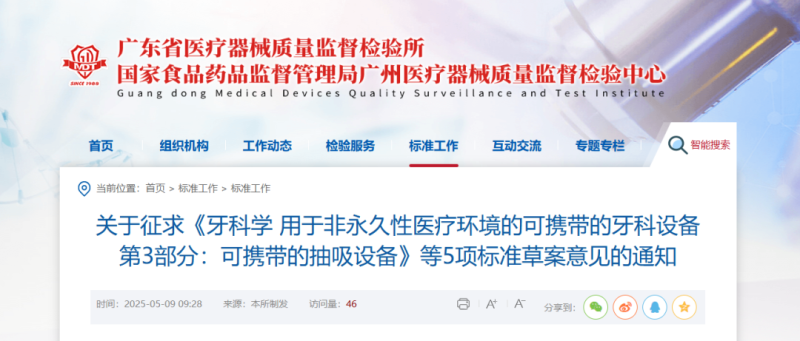 近日,廣東省醫(yī)療器械質(zhì)量監(jiān)督檢驗所發(fā)布通知稱,根據(jù)《國家藥監(jiān)局綜合司關(guān)于印發(fā)2025年醫(yī)療器械行業(yè)標(biāo)準(zhǔn)制修訂計劃項目的通知》的要求,以及全國口腔材料和器械設(shè)備標(biāo)準(zhǔn)化技術(shù)委員會齒科設(shè)備與器械分技術(shù)委員會2025年的標(biāo)準(zhǔn)制修訂工作安排,齒科分技委組織相關(guān)起草單位完成了《牙科學(xué) 用于非永久性醫(yī)療環(huán)境的可攜帶的牙科設(shè)備 第3部分:可攜帶的抽吸設(shè)備》《牙科學(xué) 根管器械 第2部分:擴(kuò)大鉆》等5項標(biāo)準(zhǔn)草案征求意見稿,具體如下: