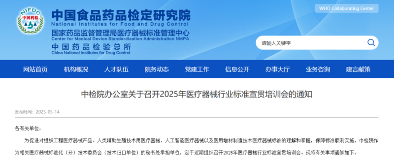 5月14日,中檢院發(fā)布一則2025年醫(yī)療器械行業(yè)標(biāo)準(zhǔn)宣貫培訓(xùn)會(huì)的通知,其中提到,該院近期將對(duì)組織工程醫(yī)療器械產(chǎn)品、人類(lèi)輔助生殖技術(shù)用醫(yī)療器械、人工智能醫(yī)療器械以及醫(yī)用增材制造技術(shù)醫(yī)療器械標(biāo)準(zhǔn)進(jìn)行宣貫培訓(xùn)。有關(guān)事項(xiàng)具體如下: