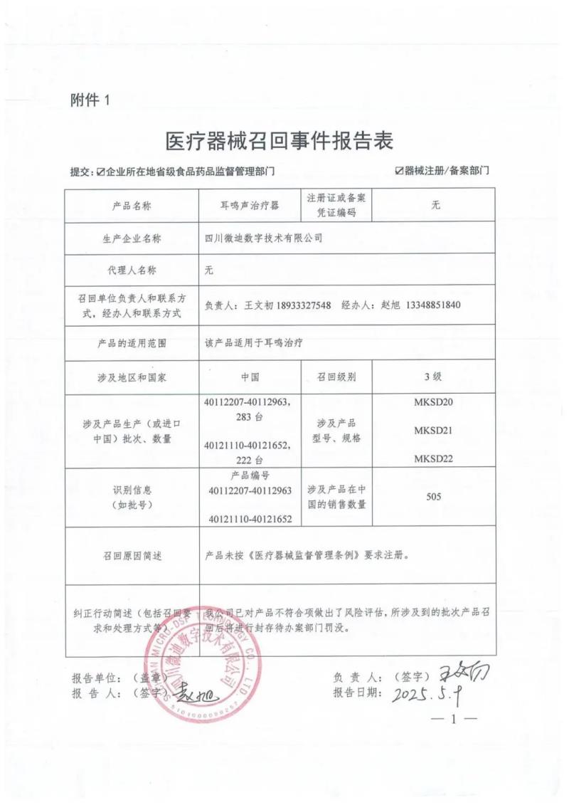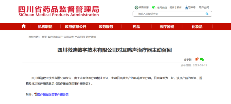 近日,四川省藥監(jiān)局發(fā)布一則醫(yī)療器械召回公告,其中提到,四川微迪數(shù)字技術(shù)有限公司報告,由于未取得醫(yī)療器械注冊證,主動召回其生產(chǎn)的耳鳴聲治療器。召回級別為三級,涉及產(chǎn)品的型號、規(guī)格及批次等詳細(xì)信息如下: