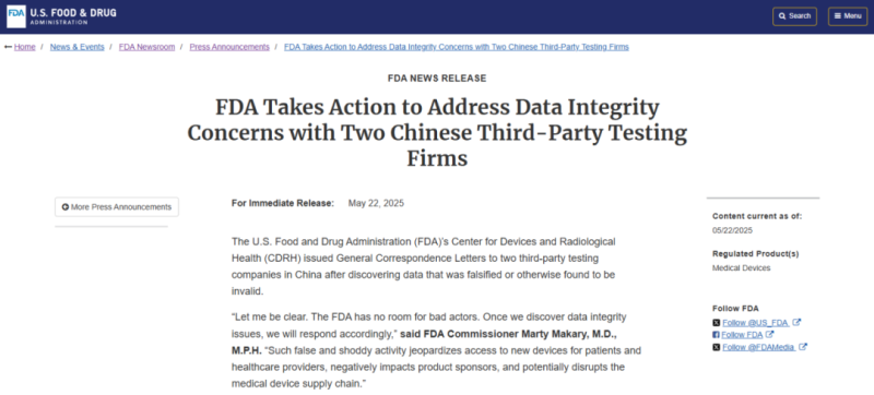 美國當(dāng)?shù)貢r(shí)間5月22日,F(xiàn)DA發(fā)布通告稱,將采取行動(dòng)解決與兩家中國第三方檢測公司的數(shù)據(jù)完整性問題。