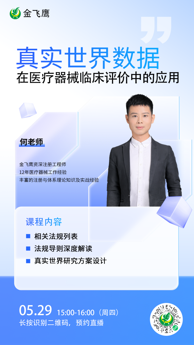 5月29日下午3點,金飛鷹資深注冊工程師、有著12年醫(yī)療器械行業(yè)從業(yè)經(jīng)驗的何老師給大家?guī)怼墩鎸嵤澜鐢?shù)據(jù)在醫(yī)療器械臨床評價中的應(yīng)用》,他將立足法規(guī)要求,結(jié)合實戰(zhàn)案例,重點解析真實世界研究方案設(shè)計要點,為企業(yè)高效開展真實世界數(shù)據(jù)應(yīng)用提供專業(yè)指導(dǎo)。
