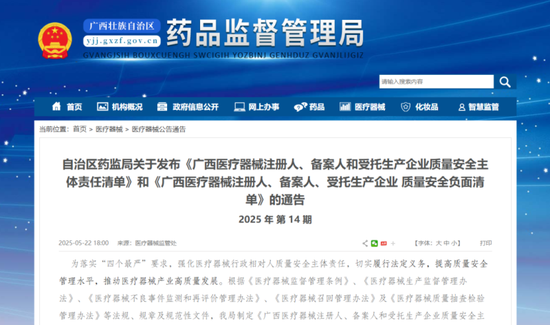 近日,廣西壯族自治區(qū)藥監(jiān)局發(fā)布《廣西醫(yī)療器械注冊人、備案人和受托生產企業(yè)質量安全主體責任清單》和《廣西醫(yī)療器械注冊人、備案人、受托生產企業(yè)質量安全負面清單》,以強化醫(yī)療器械行政相對人質量安全主體責任,切實履行法定義務,提高質量安全管理水平,推動醫(yī)療器械產業(yè)高質量發(fā)展。