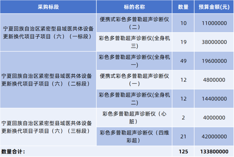 據(jù)了解,本次采購(gòu)項(xiàng)目分為三個(gè)標(biāo)段,總預(yù)算達(dá) 1.338 億元,涉及 125 臺(tái)彩色多普勒超聲診斷儀,涵蓋便攜式、全身機(jī)、心臟以及四維彩超。