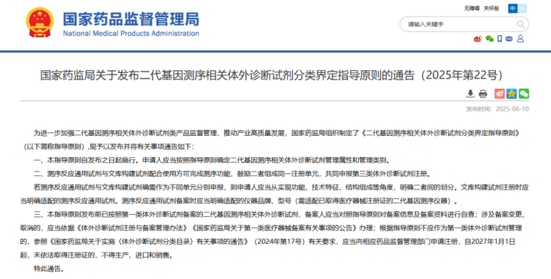6月10日,國家藥監(jiān)局發(fā)布《二代基因測序相關(guān)體外診斷試劑分類界定指導原則》(以下簡稱《指導原則》),并就《指導原則》實施的有關(guān)事項通告如下: