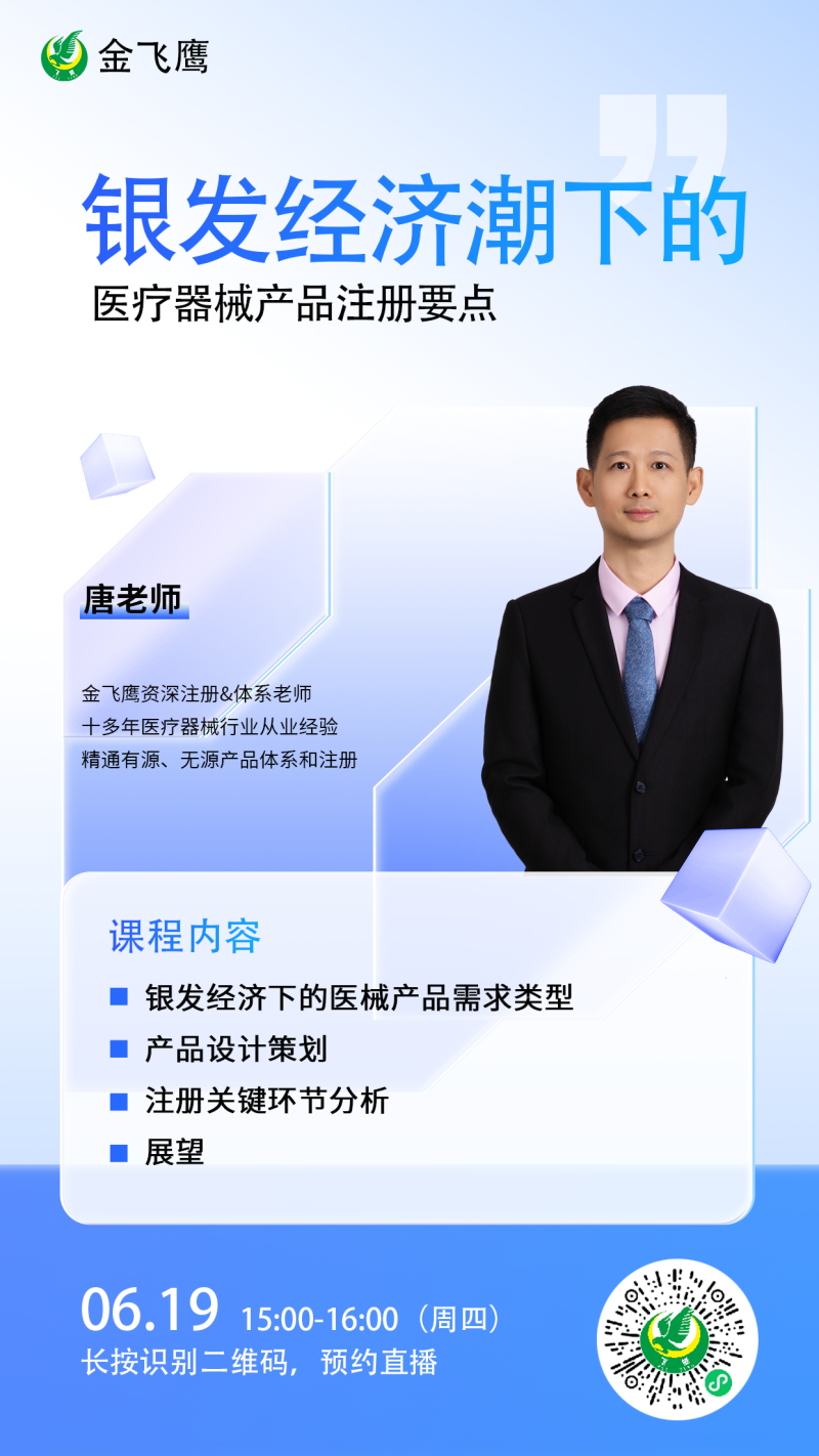 金飛鷹直播培訓(xùn),是每周一次的固定培訓(xùn)欄目,優(yōu)選金飛鷹國(guó)內(nèi)外資深注冊(cè)/項(xiàng)目老師定期為大家講解醫(yī)療器械注冊(cè)相關(guān)知識(shí),解答大家在醫(yī)療器械注冊(cè)過程中的諸多疑問。