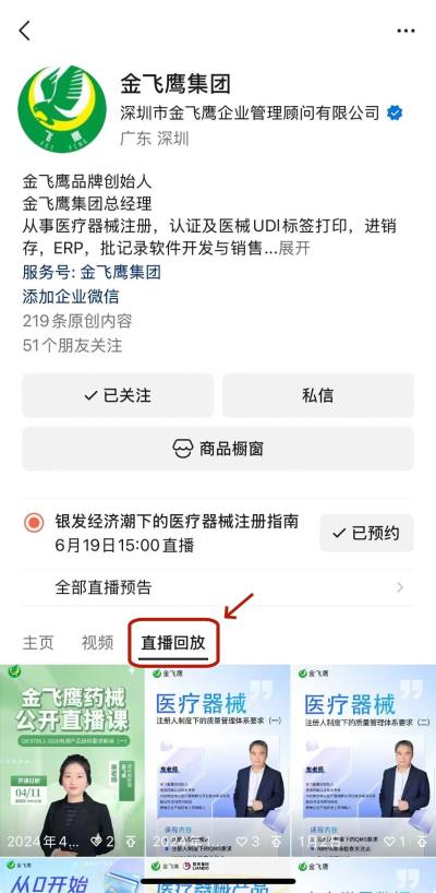 往期直播培訓(xùn)課程支持回放,關(guān)注“金飛鷹藥械咨詢服務(wù)”視頻號(hào)并點(diǎn)擊視頻號(hào)主頁(yè),即可查看“直播回放”哦~