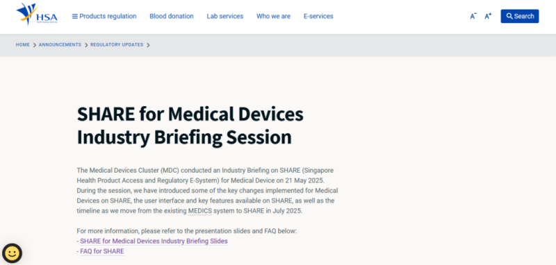 近日,新加坡HSA發(fā)布了有關(guān)醫(yī)療器械注冊(cè)提交新系統(tǒng)SHARE(Singapore Health Product Access and Regulatory E-System)的公告,介紹了SHARE與原有MEDICS系統(tǒng)相比的一些關(guān)鍵變化、SHARE上可用的用戶界面和主要功能,同時(shí)給出了有關(guān)SHARE逐步推進(jìn)使用的關(guān)鍵時(shí)間線。