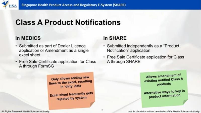 ↑ 在MEDICS系統(tǒng)中,A類產(chǎn)品通知作為經(jīng)銷商許可證申請(qǐng)或變更的組成部分,通過(guò)單一Excel表格提交,產(chǎn)品自由銷售證書需通過(guò)FormSG申請(qǐng);而在SHARE中,A類產(chǎn)品通知作為獨(dú)立的“產(chǎn)品通知”申請(qǐng)?zhí)峤唬a(chǎn)品自由銷售證書可直接通過(guò)SHARE申請(qǐng)。