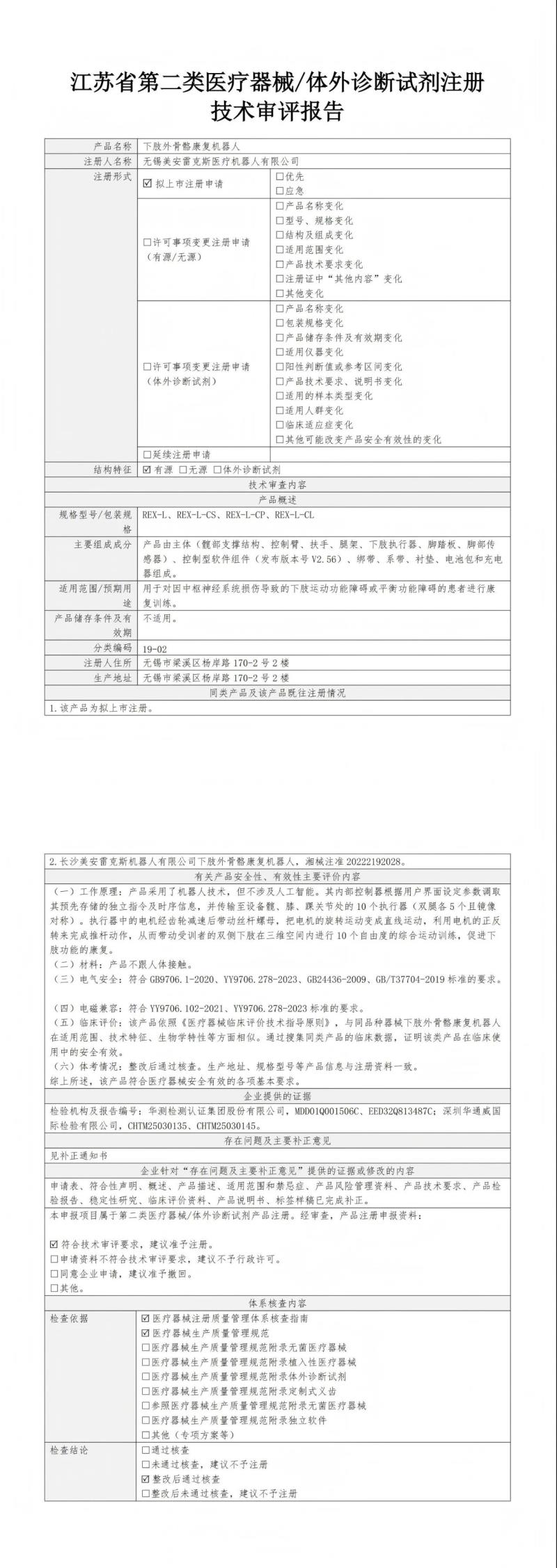 近日,江蘇省藥監(jiān)局公布了2025年5月批準(zhǔn)注冊的磁刺激治療儀、重組膠原蛋白液體敷料、生命體征檢測儀、一次性使用無菌皮膚滾針、短波治療儀、艾灸儀、醫(yī)用透明質(zhì)酸鈉凝膠敷料、下肢外骨骼康復(fù)機(jī)器人等164個醫(yī)療器械產(chǎn)品目錄,同時隨附了所有產(chǎn)品的技術(shù)審評報告,我們其中“下肢外骨骼康復(fù)機(jī)器人”(預(yù)期用途:用于對因中樞神經(jīng)系統(tǒng)損傷導(dǎo)致的下肢運(yùn)動功能障礙或平衡功能障礙的患者進(jìn)行康復(fù)訓(xùn)練)的技術(shù)審評報告以圖片形式轉(zhuǎn)載如下: