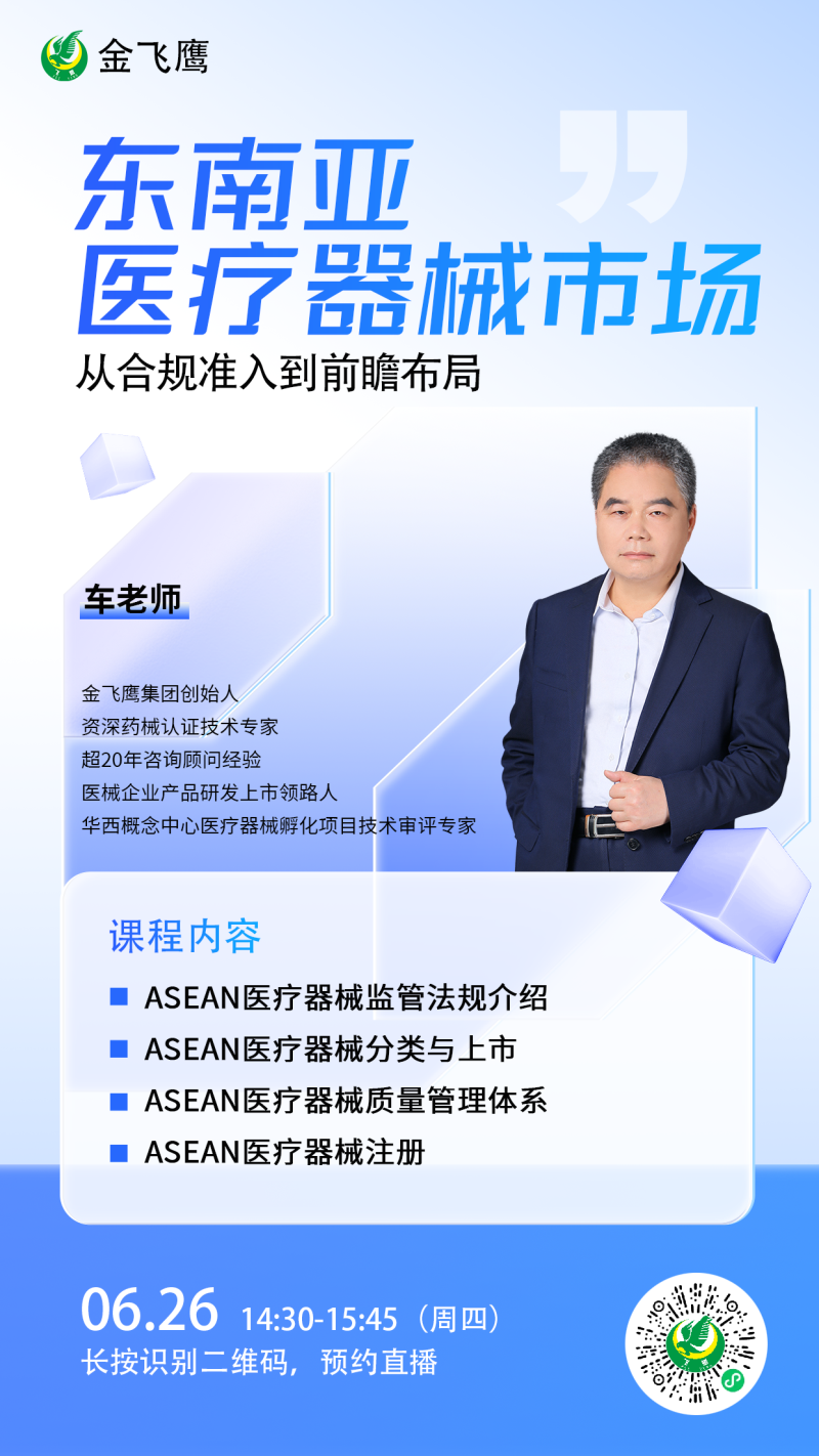 為助力國內(nèi)醫(yī)療器械企業(yè)把握這一黃金機遇,我們聯(lián)合成都高新區(qū)數(shù)智醫(yī)療創(chuàng)新聯(lián)盟特別策劃了“瀾湄醫(yī)貿(mào)新航道——中國-東南亞器械出口政策解析與市場掘金沙龍”,本場沙龍即將于6月26日14:00在成都前沿醫(yī)學中心E1棟二層巴黎路演廳舉行,屆時將由金飛鷹集團創(chuàng)始人車老師跟大家分享東南亞醫(yī)療器械市場準入要求,同時,多家協(xié)辦單位專家將聯(lián)袂帶來國際經(jīng)貿(mào)形勢分析及風險應對、出口外貿(mào)企業(yè)金融政策等干貨內(nèi)容,與參會企業(yè)共同探討市場準入要點、產(chǎn)品定位策略及本地化運營方案,助力醫(yī)療器械企業(yè)把握政策紅利窗口期,共享東南亞市場掘金機遇!