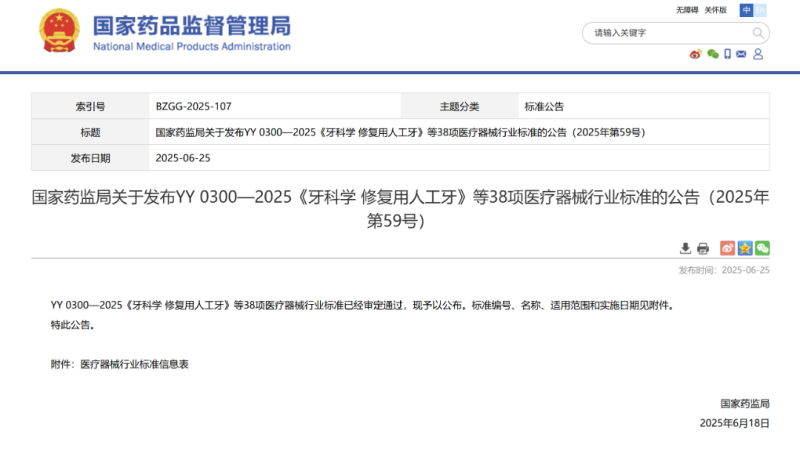 6月25日,國家藥監(jiān)局發(fā)布YY 0300—2025《牙科學(xué) 修復(fù)用人工牙》、YY 0780—2025《中醫(yī)器械 電針治療儀》、YY/T 1973—2025《醫(yī)用下肢外骨骼機(jī)器人》、YY/T 1975—2025《遠(yuǎn)紅外磁療貼(袋)》、YY/T 1979—2025《中醫(yī)器械刮痧器具》等38項(xiàng)目醫(yī)療器械行業(yè)標(biāo)準(zhǔn),其中13項(xiàng)標(biāo)準(zhǔn)為修訂,25項(xiàng)標(biāo)準(zhǔn)是新制定,最早自2026年7月1日起實(shí)施。