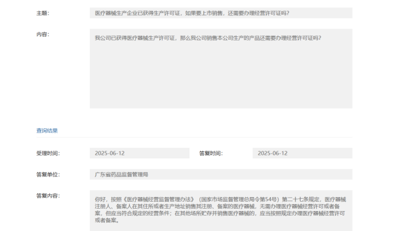 根據(jù)廣東省藥監(jiān)局的答復(fù),按照《醫(yī)療器械經(jīng)營監(jiān)督管理辦法》(國家市場監(jiān)督管理總局令第54號)第二十七條規(guī)定,醫(yī)療器械注冊人、備案人在其住所或者生產(chǎn)地址銷售其注冊、備案的醫(yī)療器械,無需辦理醫(yī)療器械經(jīng)營許可或者備案,但應(yīng)當(dāng)符合規(guī)定的經(jīng)營條件;在其他場所貯存并銷售醫(yī)療器械的,應(yīng)當(dāng)按照規(guī)定辦理醫(yī)療器械經(jīng)營許可或者備案。