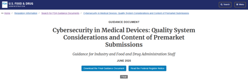 6月27日,F(xiàn)DA發(fā)布有關(guān)醫(yī)療器械網(wǎng)絡(luò)安全的指南文件Cybersecurity in Medical Devices:Quality System Considerations and Content of Premarket Submissions,用以取代 2023 年 9 月 27 日發(fā)布的最終指南“醫(yī)療器械中的網(wǎng)絡(luò)安全:質(zhì)量體系注意事項和上市前提交的內(nèi)容”。該指南首次將網(wǎng)絡(luò)安全要求從“推薦性指南”升級為“法定強制”,全面強化醫(yī)療器械全生命周期的網(wǎng)絡(luò)安全監(jiān)管。