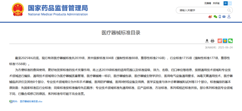 近日,國家藥監(jiān)局發(fā)布《醫(yī)療器械標(biāo)準(zhǔn)目錄》,其中提到,截至2025年6月24日,現(xiàn)行有效醫(yī)療器械標(biāo)準(zhǔn)共2039項(xiàng),其中國家標(biāo)準(zhǔn)304項(xiàng)(強(qiáng)制性標(biāo)準(zhǔn)88項(xiàng),推薦性標(biāo)準(zhǔn)216項(xiàng)),行業(yè)標(biāo)準(zhǔn)1735項(xiàng)(強(qiáng)制性標(biāo)準(zhǔn)177項(xiàng),推薦性標(biāo)準(zhǔn)1558項(xiàng))。