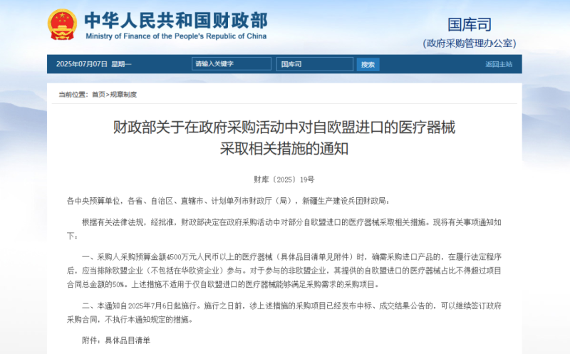 一、采購人采購預(yù)算金額4500萬元人民幣以上的醫(yī)療器械(具體品目清單見附件)時,確需采購進口產(chǎn)品的,在履行法定程序后,應(yīng)當排除歐盟企業(yè)(不包括在華歐資企業(yè))參與。對于參與的非歐盟企業(yè),其提供的自歐盟進口的醫(yī)療器械占比不得超過項目合同總金額的50%。上述措施不適用于僅自歐盟進口的醫(yī)療器械能夠滿足采購需求的采購項目。
