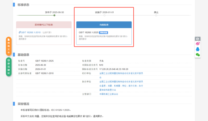 據(jù)全國標(biāo)準(zhǔn)信息公共服務(wù)平臺近日公布,GB/T 18268.1-2025《測量、控制和實(shí)驗(yàn)室用的電設(shè)備 電磁兼容性要求 第1部分:通用要求》推薦性國家標(biāo)準(zhǔn)批準(zhǔn)發(fā)布,該標(biāo)準(zhǔn)即將替代GB/T 18268.1-2010,于2026年1月1日起正式實(shí)施。據(jù)悉,該標(biāo)準(zhǔn)等同采用IEC國際標(biāo)準(zhǔn):IEC 61326-1:2020。