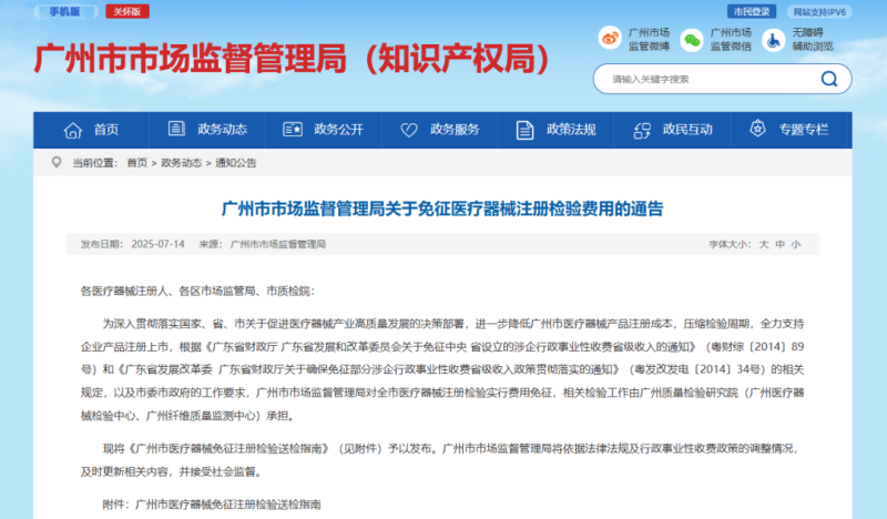 7月14日,廣州市市場監(jiān)督管理局發(fā)布《廣州市醫(yī)療器械免征注冊檢驗送檢指南》(以下簡稱《指南》),對全市醫(yī)療器械注冊檢驗實行費用免征,相關(guān)檢驗工作由廣州質(zhì)量檢驗研究院(廣州醫(yī)療器械檢驗中心、廣州纖維質(zhì)量監(jiān)測中心)承擔。