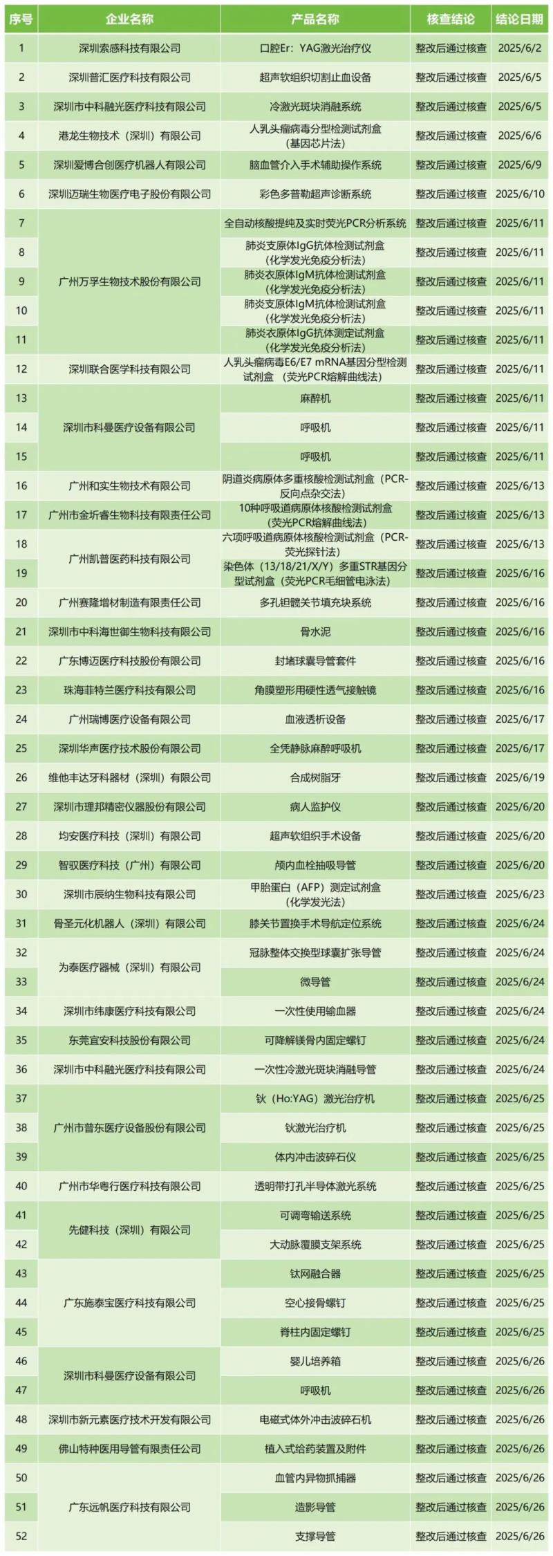 7月16日,廣東省藥監(jiān)局官網(wǎng)公布2025年6月醫(yī)療器械注冊(cè)質(zhì)量管理體系核查結(jié)果,包括深圳索感科技有限公司的口腔Er:YAG激光治療儀、廣州萬孚生物技術(shù)股份有限公司的全自動(dòng)核酸提純及實(shí)時(shí)熒光PCR分析系統(tǒng)、廣州市普東醫(yī)療設(shè)備股份有限公司的鈥(Ho:YAG)激光治療機(jī)、深圳市科曼醫(yī)療設(shè)備有限公司的呼吸機(jī)等共計(jì)52款產(chǎn)品,均為“整改后通過核查”。具體明細(xì)見下方表格: