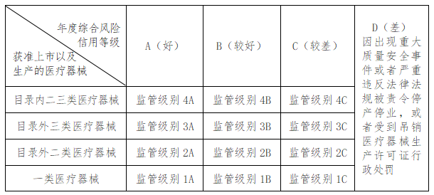 第七條 根據(jù)本市醫(yī)療器械生產(chǎn)企業(yè)獲準(zhǔn)上市以及生產(chǎn)的醫(yī)療器械情形、企業(yè)年度綜合風(fēng)險(xiǎn)信用等級,監(jiān)管級別劃分為以下類別。