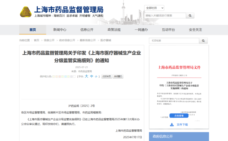 7月21日,上海市藥監(jiān)局發(fā)布《上海市醫(yī)療器械生產(chǎn)企業(yè)分級監(jiān)管實(shí)施細(xì)則》(以下簡稱《實(shí)施細(xì)則》),《實(shí)施細(xì)則》適用于對上海市醫(yī)療器械生產(chǎn)企業(yè)開展的日常監(jiān)督管理活動(dòng),所稱生產(chǎn)企業(yè)包括醫(yī)療器械注冊人、備案人以及受托生產(chǎn)企業(yè)。