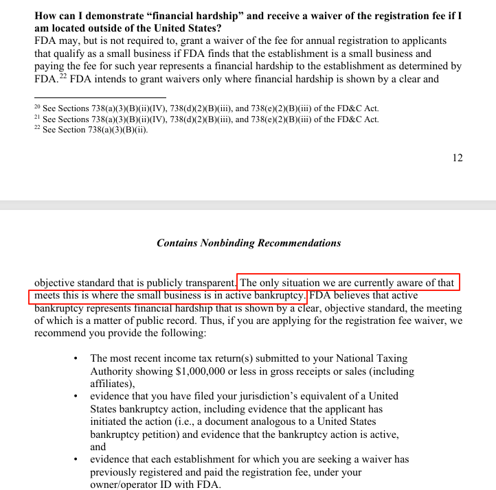 FDA 僅會在申請人通過公開透明的明確客觀標準證明其經(jīng)濟困難時授予豁免。目前FDA確認符合該標準的 唯一情形 為:企業(yè)處于 active bankruptcy(在審破產(chǎn)程序)狀態(tài)(FDA認為在審破產(chǎn)程序符合“明確客觀標準”,且該狀態(tài)屬于公開法律記錄)。