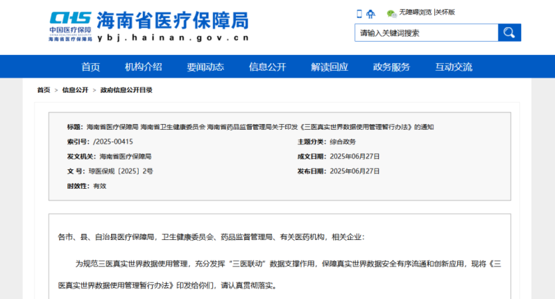 近日,海南省醫(yī)療保障局、海南省衛(wèi)生健康委員會(huì)、海南省藥品監(jiān)督管理局聯(lián)合印發(fā)《三醫(yī)真實(shí)世界數(shù)據(jù)使用管理暫行辦法》(以下簡(jiǎn)稱《辦法》),自2025年8月1日起正式施行,有效期5年。作為國內(nèi)首個(gè)明確整合醫(yī)療、醫(yī)保、醫(yī)藥(以下簡(jiǎn)稱“三醫(yī)”)三方真實(shí)世界數(shù)據(jù)資源并規(guī)范其應(yīng)用的管理文件,《辦法》的出臺(tái)標(biāo)志著海南在利用真實(shí)世界證據(jù)支持藥械研發(fā)與評(píng)審、優(yōu)化醫(yī)保決策方面邁出關(guān)鍵一步。