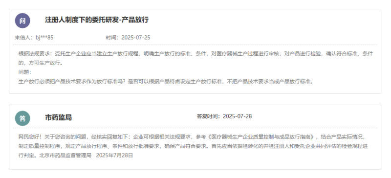 國家藥監(jiān)局發(fā)布的《關(guān)于進(jìn)一步加強(qiáng)醫(yī)療器械注冊人委托生產(chǎn)監(jiān)督管理的公告(2024年第38號)》提到:“受托生產(chǎn)企業(yè)應(yīng)當(dāng)建立生產(chǎn)放行規(guī)程,明確生產(chǎn)放行的標(biāo)準(zhǔn)、條件,對醫(yī)療器械生產(chǎn)過程進(jìn)行審核,對產(chǎn)品進(jìn)行檢驗(yàn),確認(rèn)符合標(biāo)準(zhǔn)、條件的,方可生產(chǎn)放行。”