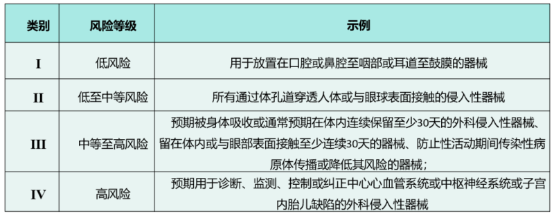 在《醫(yī)療器械注冊指南》中,加納FDA根據(jù)產(chǎn)品風(fēng)險(xiǎn)從低到高,將醫(yī)療器械分為Ⅰ、Ⅱ、Ⅲ、Ⅳ四個(gè)風(fēng)險(xiǎn)等級。下表列出了醫(yī)療器械的四個(gè)風(fēng)險(xiǎn)類別,企業(yè)可根據(jù)示例內(nèi)容對產(chǎn)品類別進(jìn)行大致判斷。另外在《醫(yī)療器械注冊指南》中,還列出了醫(yī)療器械分類的16條具體規(guī)則,根據(jù)這些規(guī)則可以更明確地判斷產(chǎn)品類別。