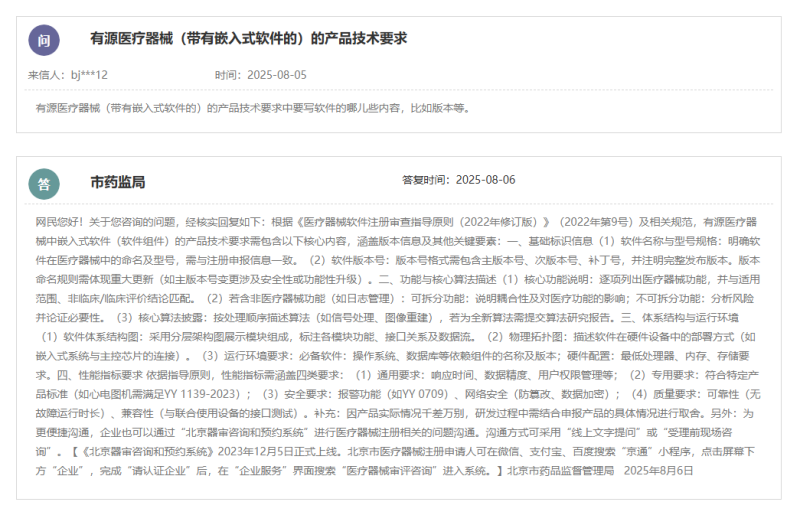根據(jù)北京市藥監(jiān)局的答復(fù),根據(jù)《醫(yī)療器械軟件注冊(cè)審查指導(dǎo)原則(2022年修訂版)》及相關(guān)規(guī)范,有源醫(yī)療器械中嵌入式軟件(軟件組件)的產(chǎn)品技術(shù)要求需包含以下核心內(nèi)容,涵蓋版本信息及其他關(guān)鍵要素:
