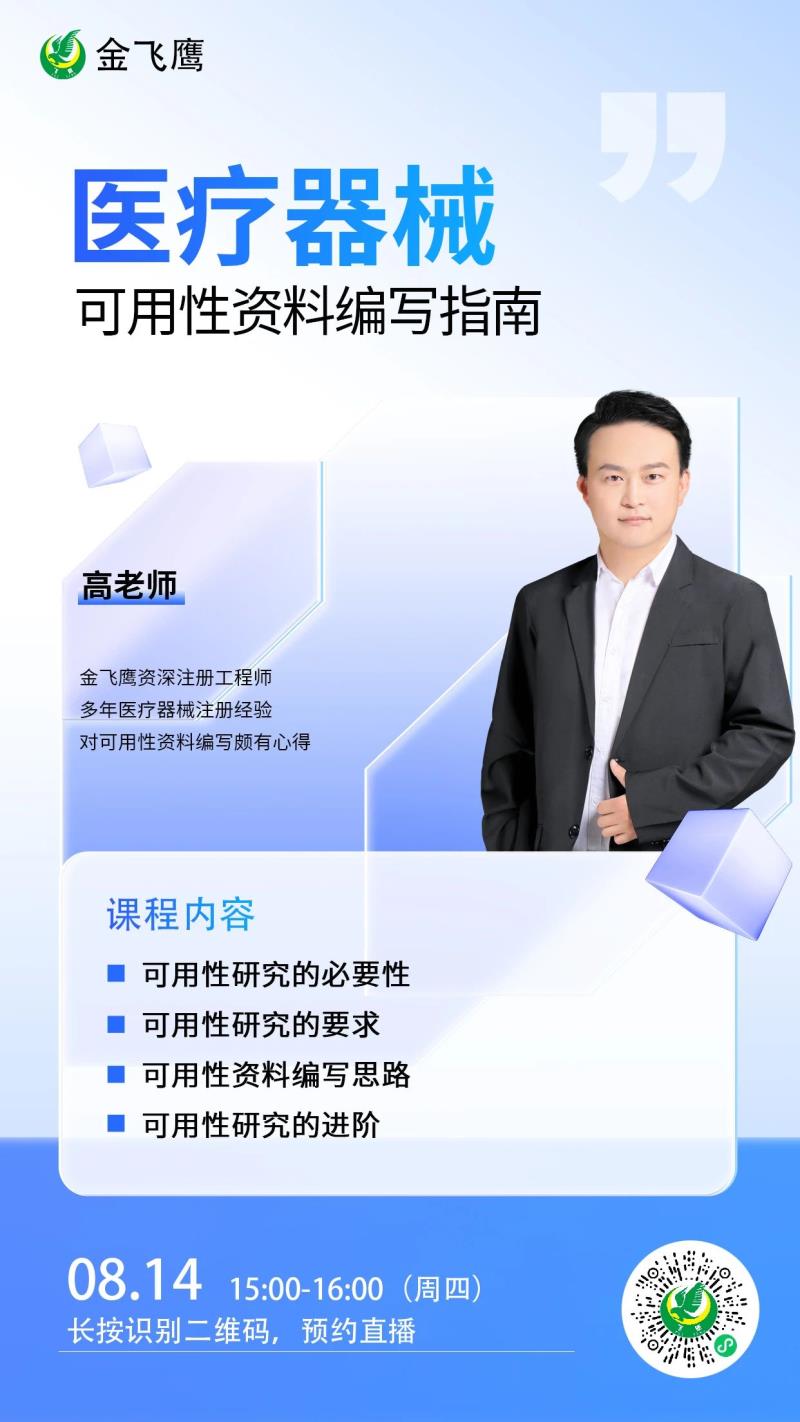 8月14日下午3點(diǎn),金飛鷹資深注冊(cè)工程師,擁有多年醫(yī)療器械行業(yè)經(jīng)驗(yàn),對(duì)可用性資料頗有研究的高老師給大家?guī)?lái)《醫(yī)療器械可用性資料編寫(xiě)指南》,他將結(jié)合實(shí)際案例,詳細(xì)拆解可用性研究資料的編寫(xiě)要素,為企業(yè)提供切實(shí)可行的指導(dǎo)建議,感興趣的朋友記得提前預(yù)約!