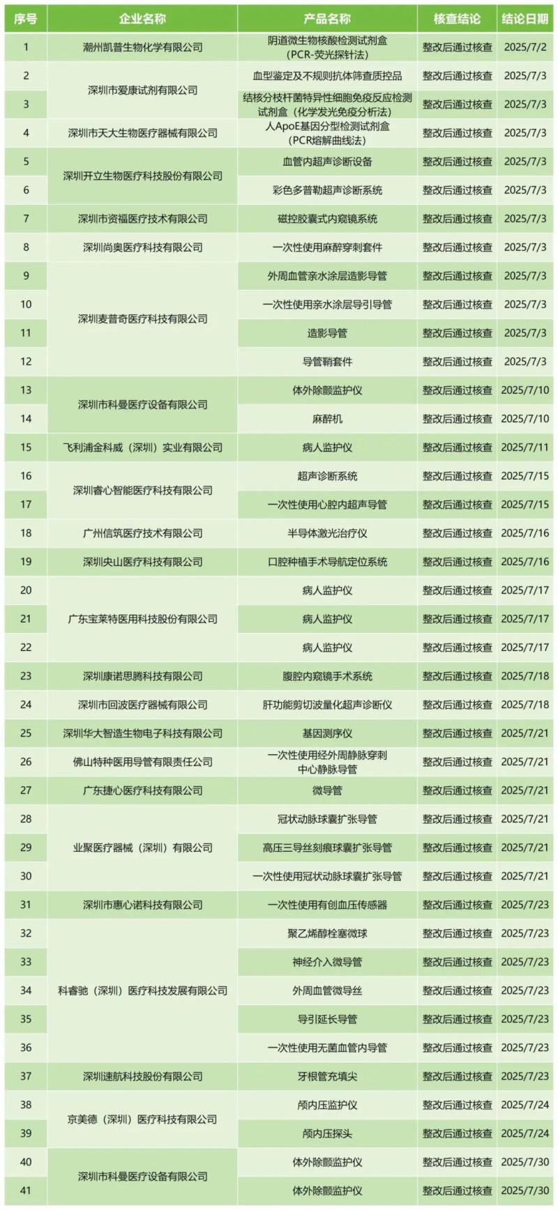 近日,廣東省藥監(jiān)局官網(wǎng)公布2025年7月醫(yī)療器械注冊(cè)質(zhì)量管理體系核查結(jié)果,包括深圳市科曼醫(yī)療設(shè)備有限公司的體外除顫監(jiān)護(hù)儀、廣州信筑醫(yī)療技術(shù)有限公司的半導(dǎo)體激光治療儀、廣東寶萊特醫(yī)用科技股份有限公司的病人監(jiān)護(hù)儀、業(yè)聚醫(yī)療器械(深圳)有限公司的冠狀動(dòng)脈球囊擴(kuò)張導(dǎo)管、科睿馳(深圳)醫(yī)療科技發(fā)展有限公司的一次性使用無(wú)菌血管內(nèi)導(dǎo)管等共計(jì)41款產(chǎn)品,均為“整改后通過(guò)核查”。具體明細(xì)見(jiàn)下方表格: