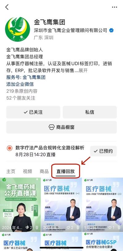 往期直播培訓(xùn)課程支持回放,關(guān)注“金飛鷹藥械咨詢服務(wù)”視頻號并點(diǎn)擊視頻號主頁,即可查看“直播回放”哦~