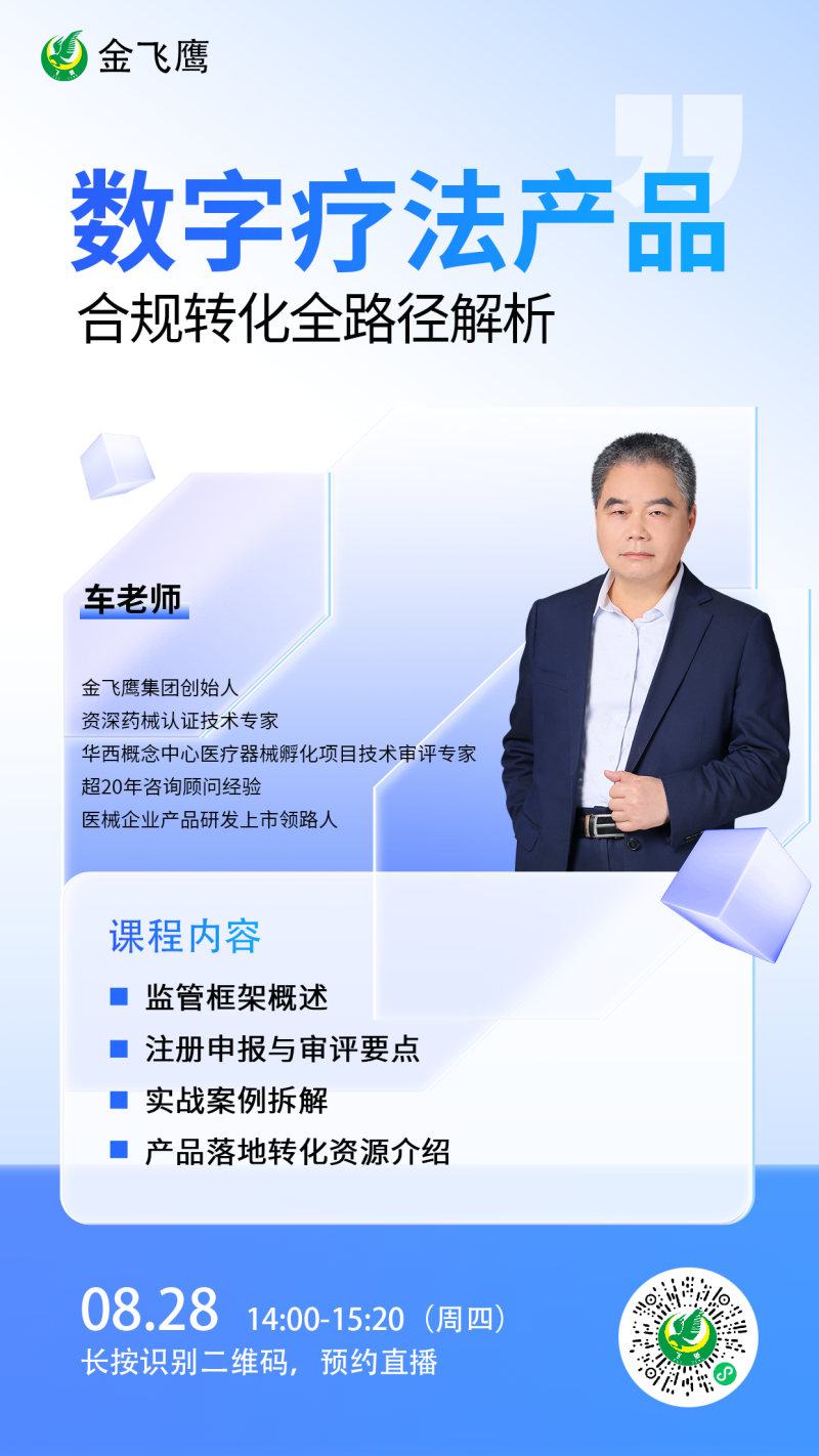 金飛鷹直播培訓(xùn),是每周一次的固定培訓(xùn)欄目,優(yōu)選金飛鷹國內(nèi)外資深注冊/項(xiàng)目老師定期為大家講解醫(yī)療器械注冊相關(guān)知識,解答大家在醫(yī)療器械注冊過程中的諸多疑問。