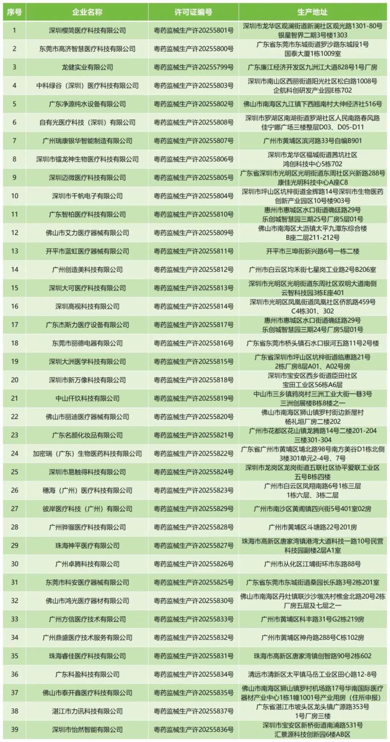 近日,廣東省藥監(jiān)局公布了《2025年7月醫(yī)療器械生產(chǎn)許可證核發(fā)清單》,據(jù)該公開數(shù)據(jù)顯示,2025年7月,中科綠谷(深圳)醫(yī)療科技有限公司、自有光醫(yī)療科技(深圳)有限公司、東莞市麗德電器有限公司、彼岸醫(yī)療科技(廣州)有限公司等共計39家企業(yè)新拿到了醫(yī)療器械生產(chǎn)許可證,具體明細如下: