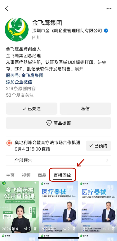 往期直播培訓(xùn)課程支持回放,關(guān)注“金飛鷹藥械咨詢服務(wù)”視頻號并點擊視頻號主頁,即可查看“直播回放”哦~