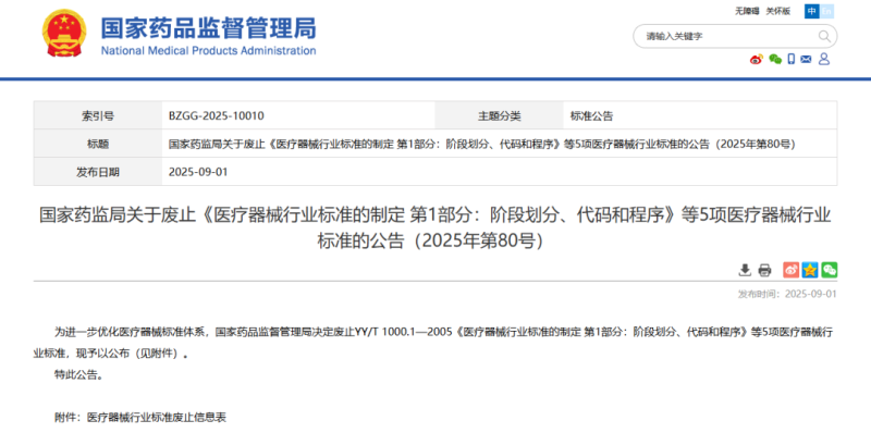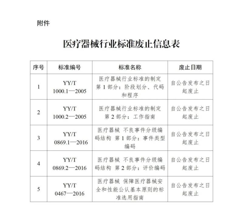 9月1日,國家藥監(jiān)局發(fā)布一則公告稱,該局決定廢止YY/T 1000.1-2005《醫(yī)療器械行業(yè)標準的制定 第1部分:階段劃分、代碼和程序》、YY/T 0869.1-2016《醫(yī)療器械 不良事件分級編碼結構 第1部分:事件類型編碼》等5項醫(yī)療器械行業(yè)標準,具體明細如下: