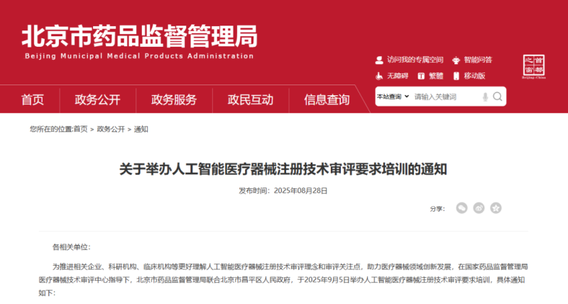 近日,北京市藥監(jiān)局發(fā)布通知,定于9月5日(周五)舉辦“人工智能醫(yī)療器械注冊(cè)技術(shù)審評(píng)要求培訓(xùn)”,具體時(shí)間及參會(huì)方式如下: